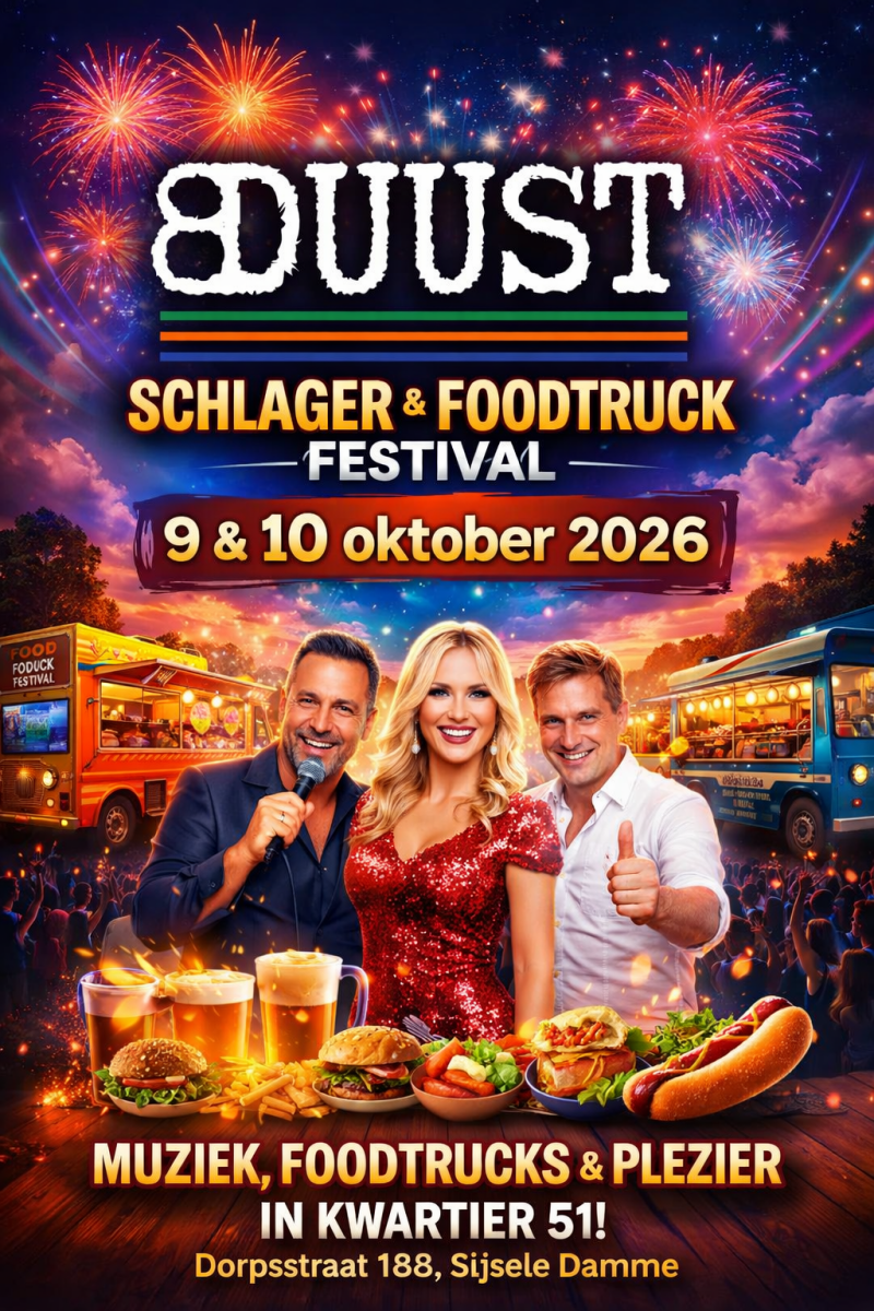 Op 9 & 10 oktober 2026 organiseert vzw 8-duust een geweldig Schlager & Foodtruck Festival op Kwartier 51, Dorpsstraat 188 in Sijsele (Damme).